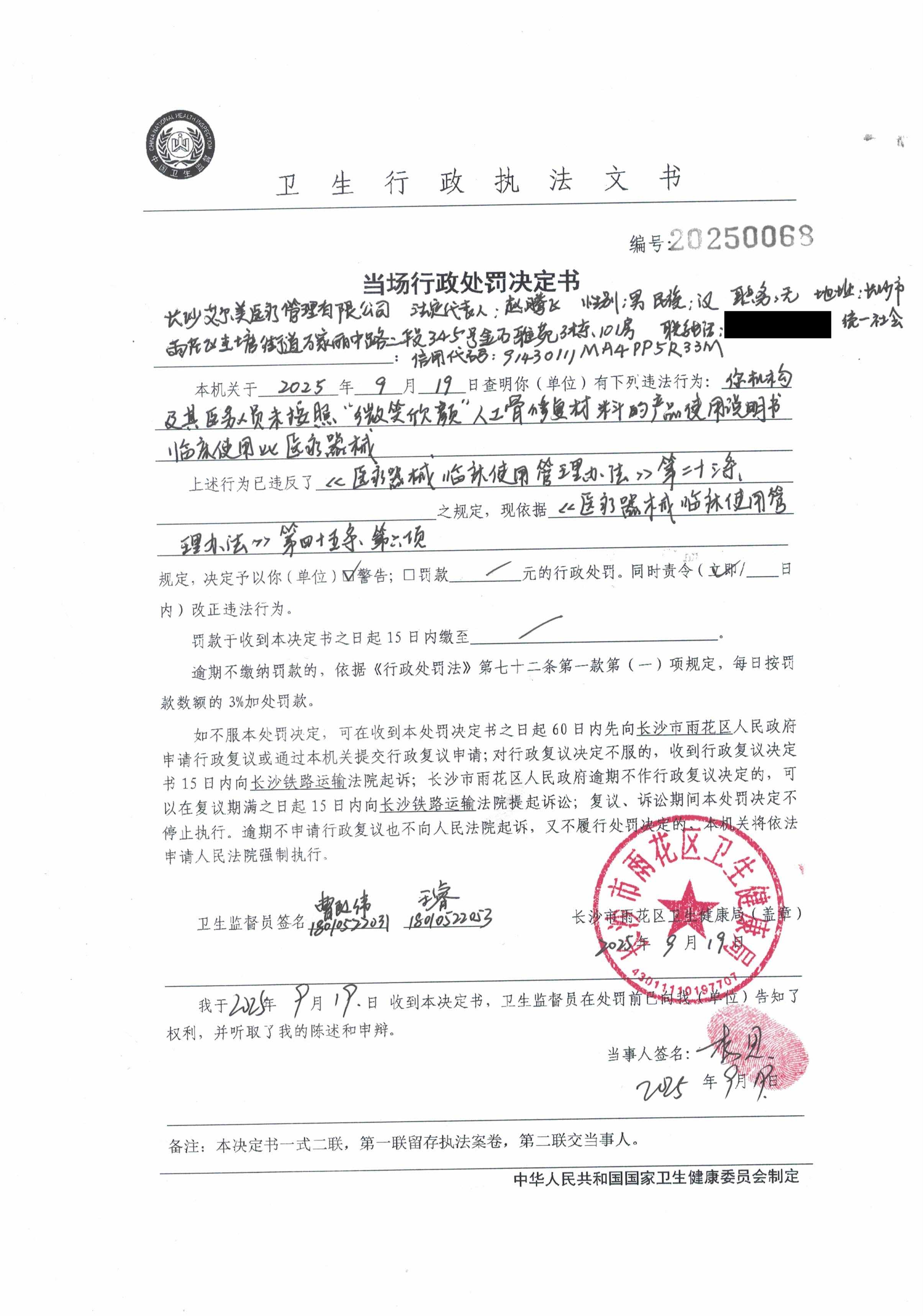 为规范卫生健康行政处罚案件信息公开行为,促进依法行政、公正执法,充分发挥qy球友会信息的曝光惩戒作用,保障公众的知情权、参与权和监督权,根据《中华人民共和国行政处罚法》《中华人民共和国qy球友会信息公开条例》等法律法规规章,我局现将长沙艾尔美医疗管理有限公司医疗机构及其医务人员未按照医疗器械临床使用说明书使用医疗器械案(20250068)的行政处罚案件信息进行公示。