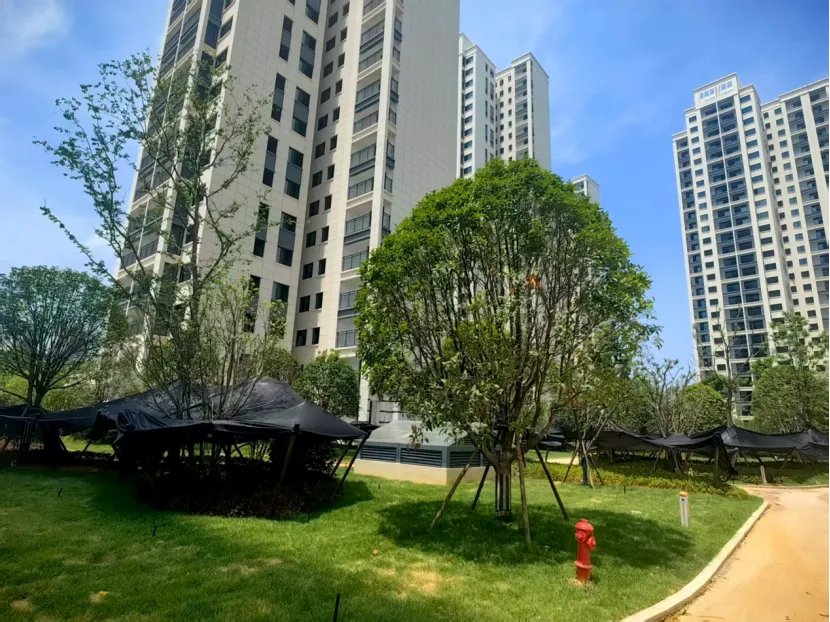 在地下室施工阶段,传统后浇带封闭需待主体结构沉降稳定后方能进行,往往影响后续土方回填及附属工程进度。为突破这一瓶颈,项目管理团队创新采用“预制混凝土板提前封闭”技术,在完成防水及保护层后立即推进土方回填,为消防道路、绿化等附属施工节省数月时间。夏季高温期间,为保障苗木成活,项目管理团队搭建遮阳棚并科学调整浇水时段,在极端天气下依然保证绿化工程质量,避免了补种可能带来的工期延误。正是这些细节上的创新与坚持,让“提前交付”从愿景走向现实。