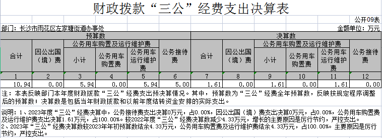 长沙市雨花区左家塘街道办事处2023年财政拨款“三公”经费支出决算表