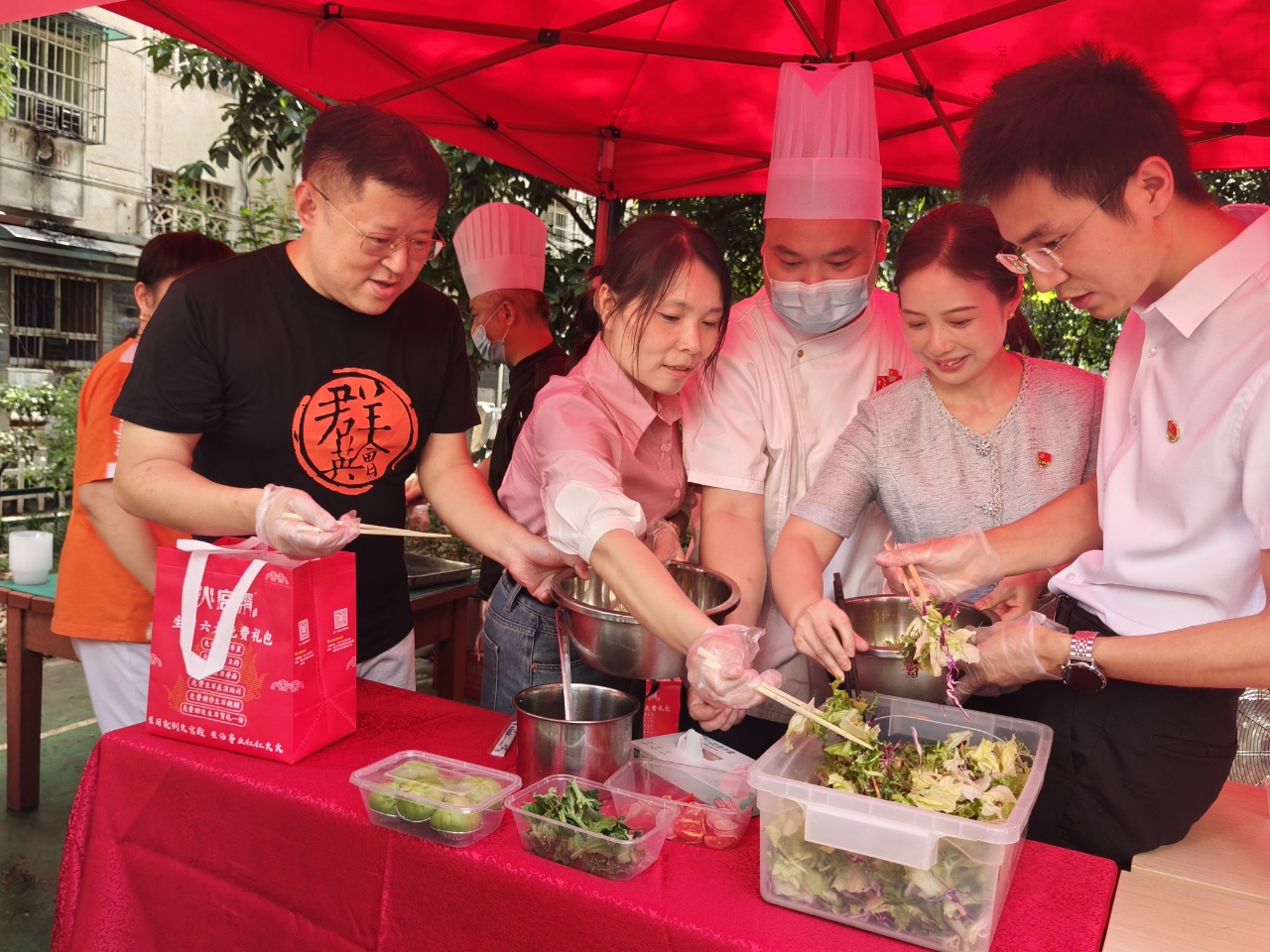 活动现场热闹非凡,来自火宫殿东塘店的大厨正和居民们一起制作轻食沙拉。在当前体重管理年倡导减油减盐的大背景下,这一环节格外引人注目,大厨们一边熟练地处理着新鲜的蔬菜,一边向居民们讲解轻食沙拉的制作要点和营养搭配知识,让大家在享受美食的同时关注自身健康。