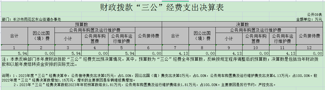 长沙市雨花区东山街道办事处2023年财政拨款“三公”经费支出决算公开